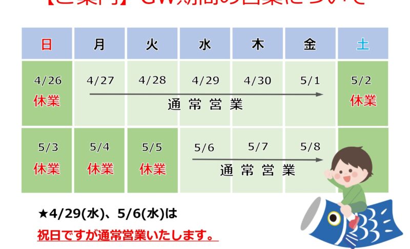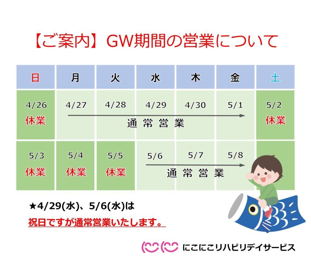にこにこリハビリデイサービス全店舗では、GW期間を下記の通りの営業体制とさせていただきます🌸